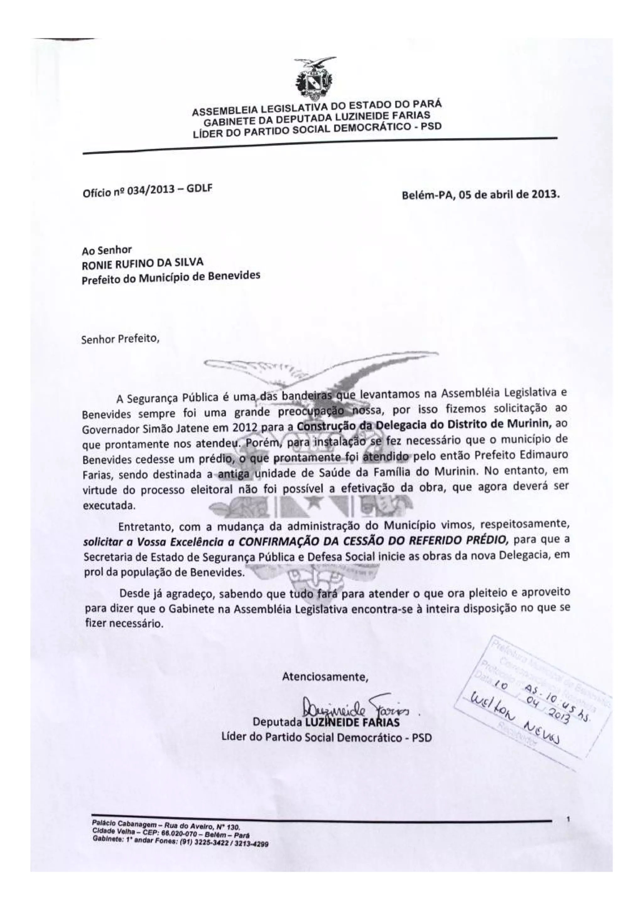 Oficio enviado ao atual Prefeito de Benevides (Ronie Silva) requerendo a confirmação da cessão do prédio onde funcionava a antiga Unidade de Saúde da Família do Murinin, para a implantação de uma delegacia. Também enviamos a todos os vereadores um comunicado informando o aguardo na resposta do Prefeito.