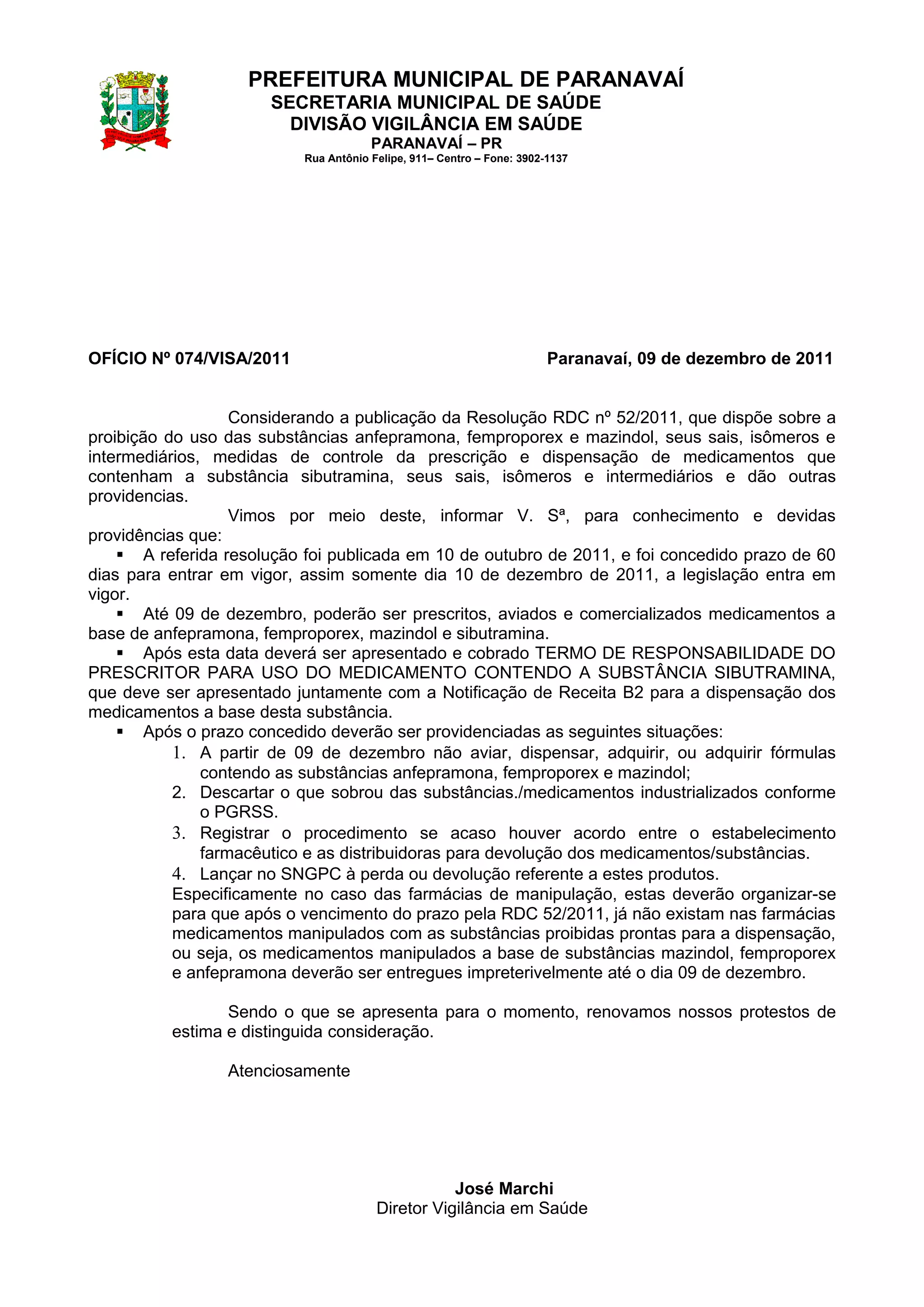 O documento informa sobre a proibição do uso de substâncias anfepramona, femproporex, mazindol e medidas de controle da prescrição e dispensação de medicamentos contendo sibutramina. Instruções incluem não aviar, dispensar ou adquirir as substâncias proibidas após 9 de dezembro e organizar a entrega de medicamentos manipulados com essas substâncias até essa data.