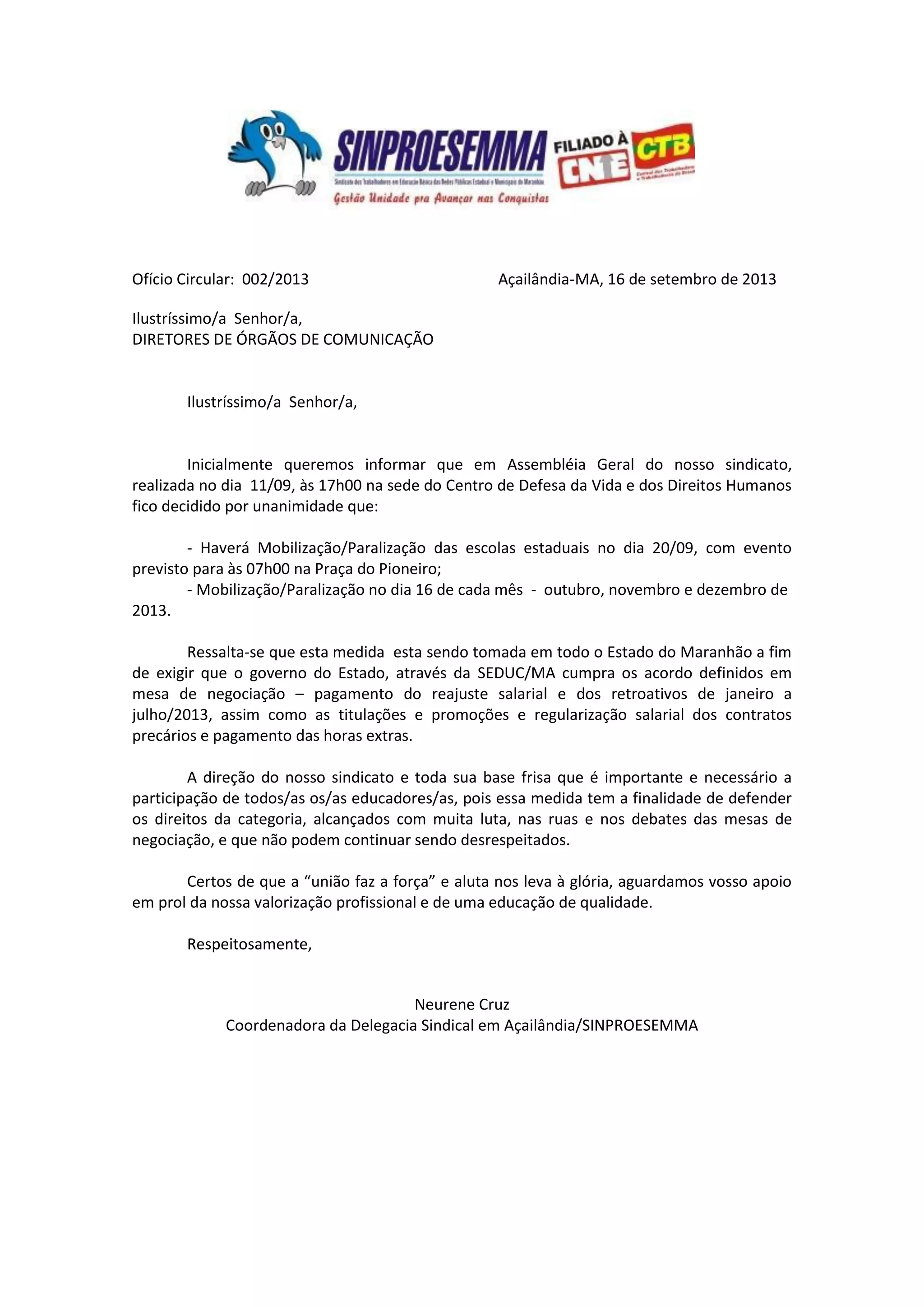 - Os professores do estado do Maranhão decidiram realizar uma mobilização/paralisação em 20 de setembro e no dia 16 de cada mês de outubro, novembro e dezembro de 2013 para exigir que o governo estadual cumpra os acordos definidos em mesa de negociação, incluindo o pagamento de reajustes salariais e benefícios atrasados.