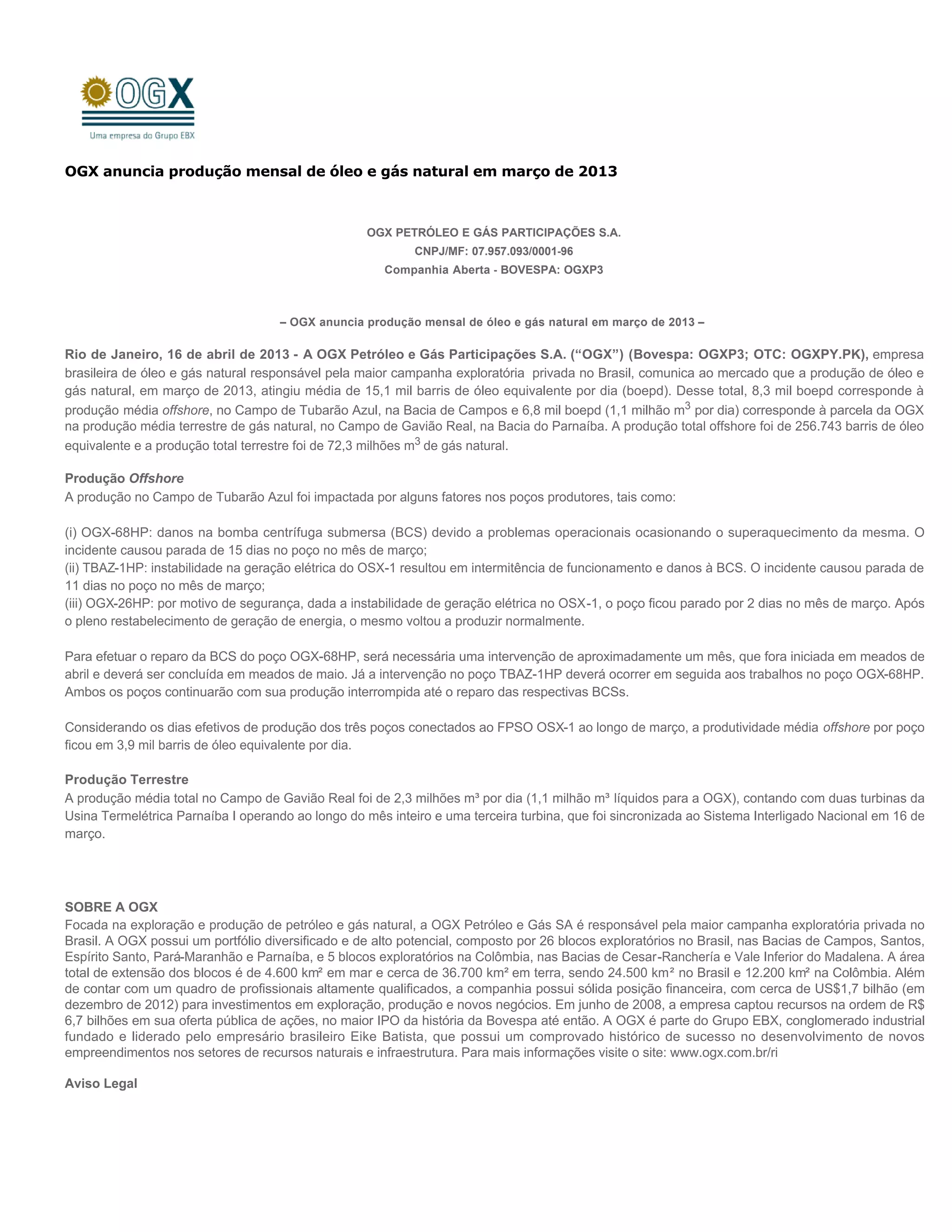 A produção de petróleo e gás da OGX em março de 2013 foi de 15,1 mil barris de óleo equivalente por dia, com problemas operacionais afetando dois poços offshore e uma intervenção planejada para reparar danos. A produção terrestre no Campo de Gavião Real foi de 1,1 milhão m3 de gás natural por dia para a OGX.