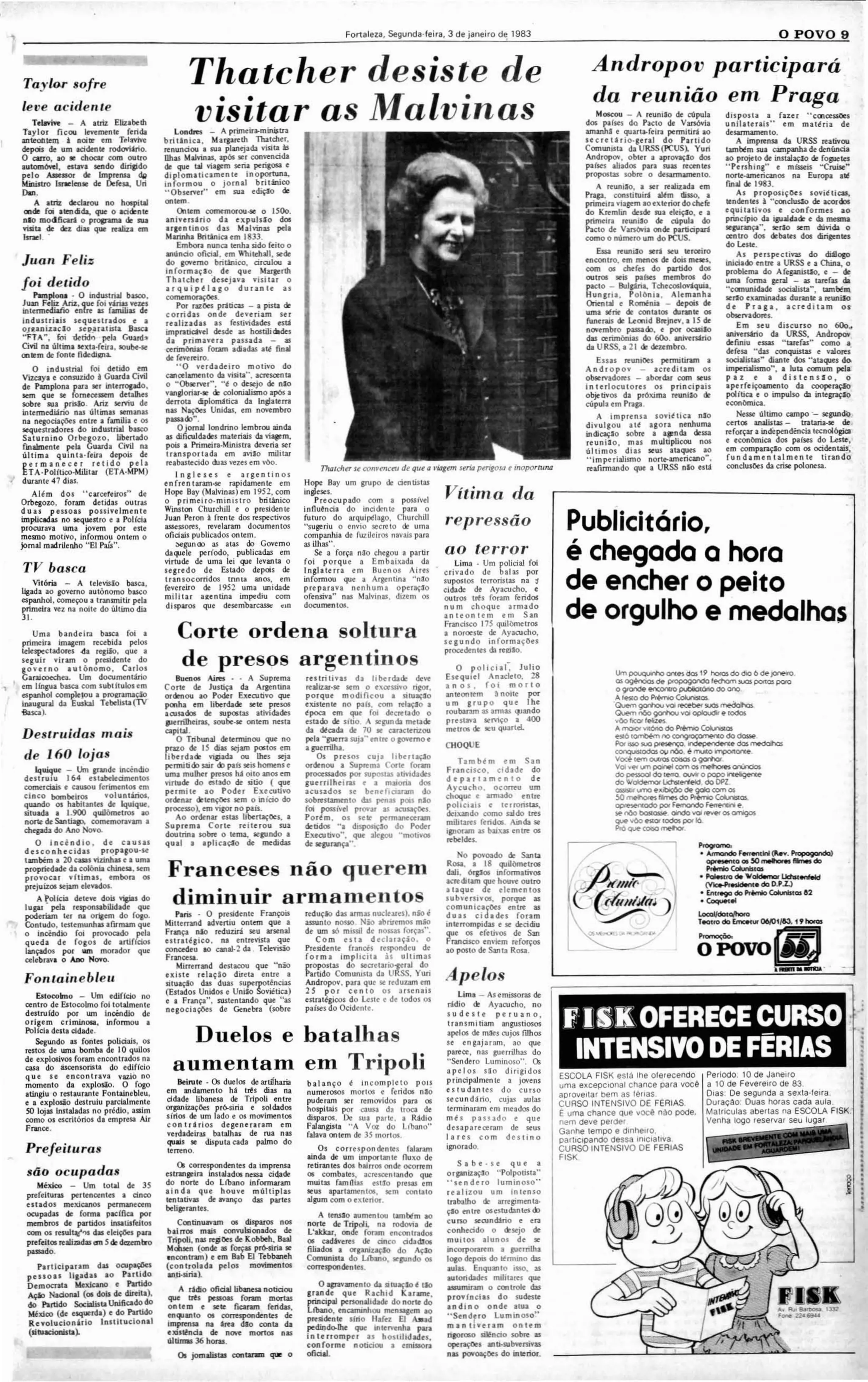 2) O secretário-geral do Partido Comunista da URSS, Yuri Andropov, participará da reunião em Praga com os líderes do Pacto de Varsóvia, sendo sua primeira viagem ao exterior desde que assumiu o cargo.