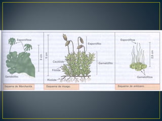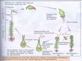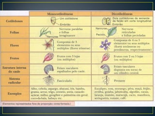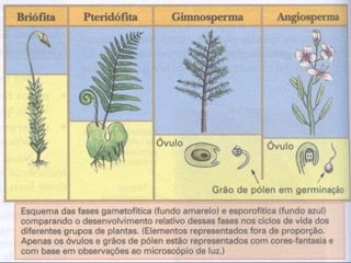 As plantas são divididas em cinco grupos principais: briófitas, pteridófitas, gimnospermas, angiospermas e plantas que se reproduzem assexuadamente.