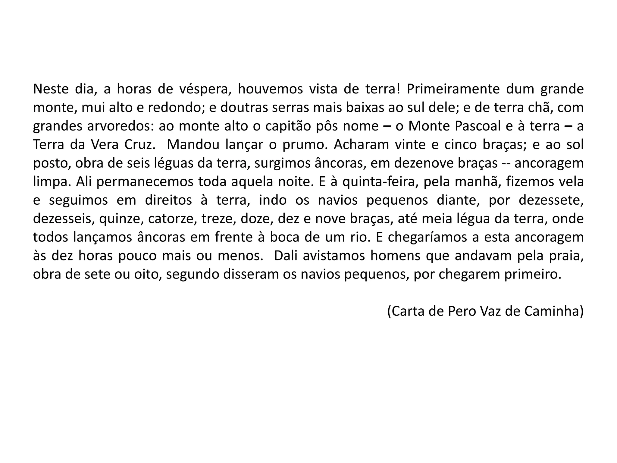 1) A tripulação avistou terra pela primeira vez, incluindo uma grande montanha redonda e outras serras menores, com arvoredos e terra plana;