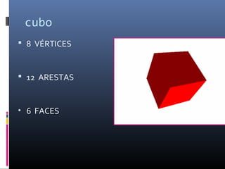 O documento lista as propriedades de formas geométricas 3D como cubo, pirâmide, prisma e prisma quadrangular, indicando o número de vértices, arestas e faces de cada uma.