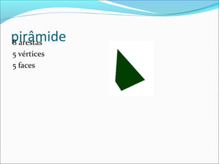 O documento descreve as características de formas geométricas tridimensionais como pirâmide, hexaedro, prisma e cubo, indicando o número de vértices, arestas e faces de cada uma.