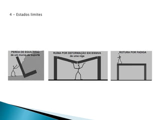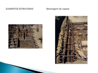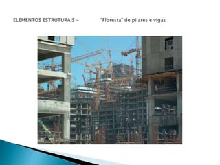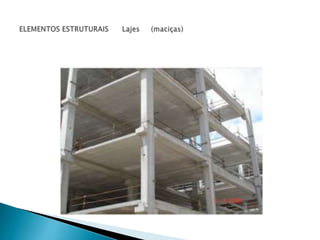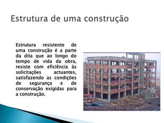O documento descreve os principais elementos estruturais de uma construção como lajes, vigas, pilares e fundações. Explica os tipos de cargas que atuam sobre uma estrutura, incluindo cargas permanentes, variáveis e acidentais, e como esses elementos trabalham juntos para suportar e transmitir essas cargas com segurança.