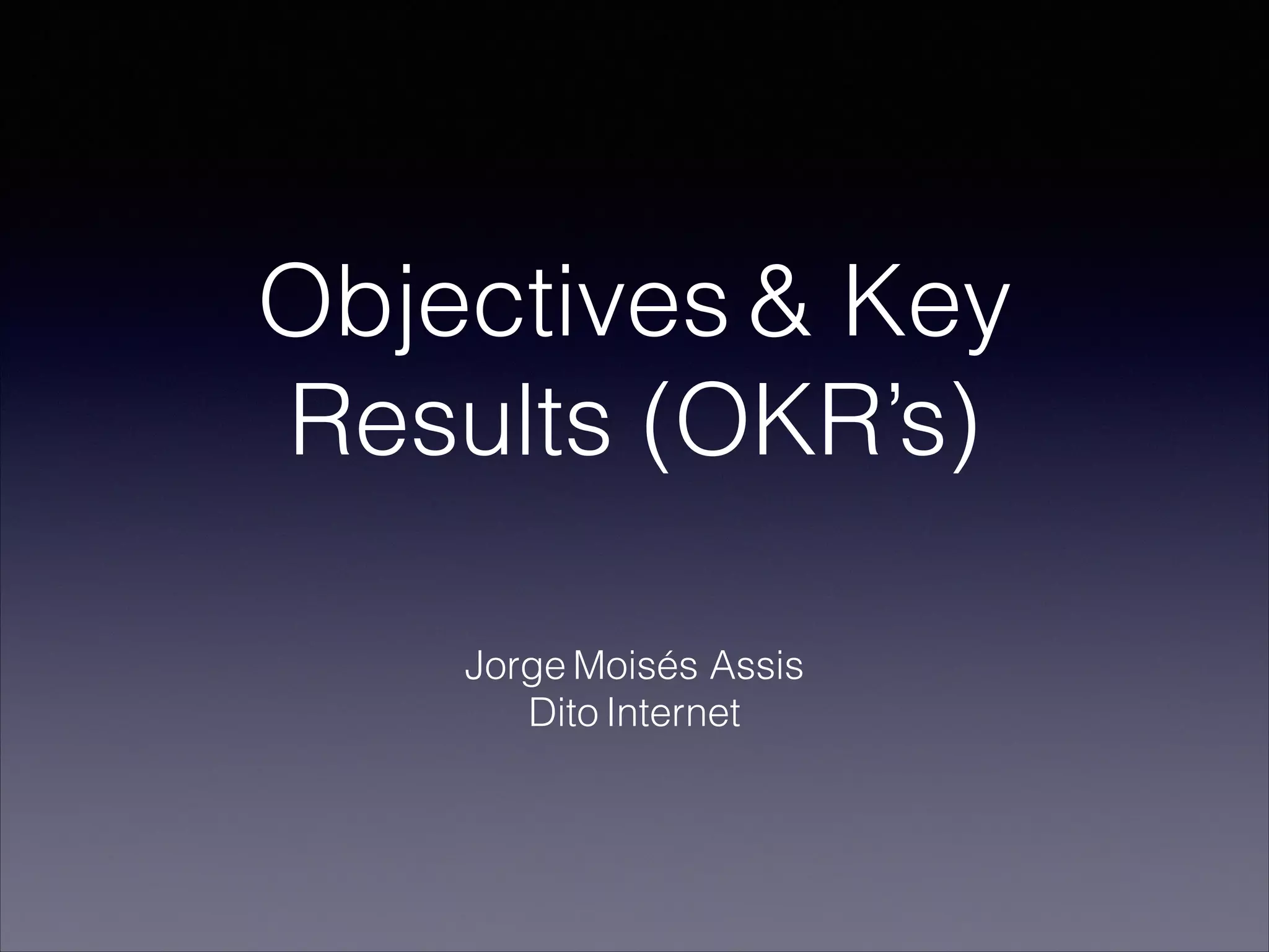 O documento explica o que são Objetivos e Resultados-Chave (OKR), um processo para definir objetivos mensuráveis para empresas, equipes e indivíduos. Os OKR surgiram na Intel na década de 1970 e foram popularizados na Google em 1999, sendo usados por outras grandes empresas para conectar objetivos a resultados concretos e manter todos na mesma direção. O processo envolve definir objetivos qualitativos e temporais com 3 ou 4 resultados quantificáveis, revisar o progresso semanalmente e atribuir notas trimestralmente para refinar
