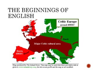 O documento descreve a história da língua inglesa desde suas origens. Apresenta como o inglês moderno surgiu a partir de dialetos germânicos falados por tribos que invadiram a Grã-Bretanha, e como foi influenciado pelo latim e francês ao longo dos séculos. Também discute a disseminação global do inglês impulsionada pelo comércio e colonização britânica.