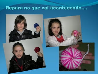 Este documento fornece instruções passo-a-passo para fazer um pom-pom usando cartão, lã e outros materiais. As instruções incluem desenhar e recortar duas circunferências sobrepostas no cartão, envolver as circunferências com fios de lã, cortar a lã para revelar o centro e prender as circunferências juntas com fios através do meio para criar um pom-pom.