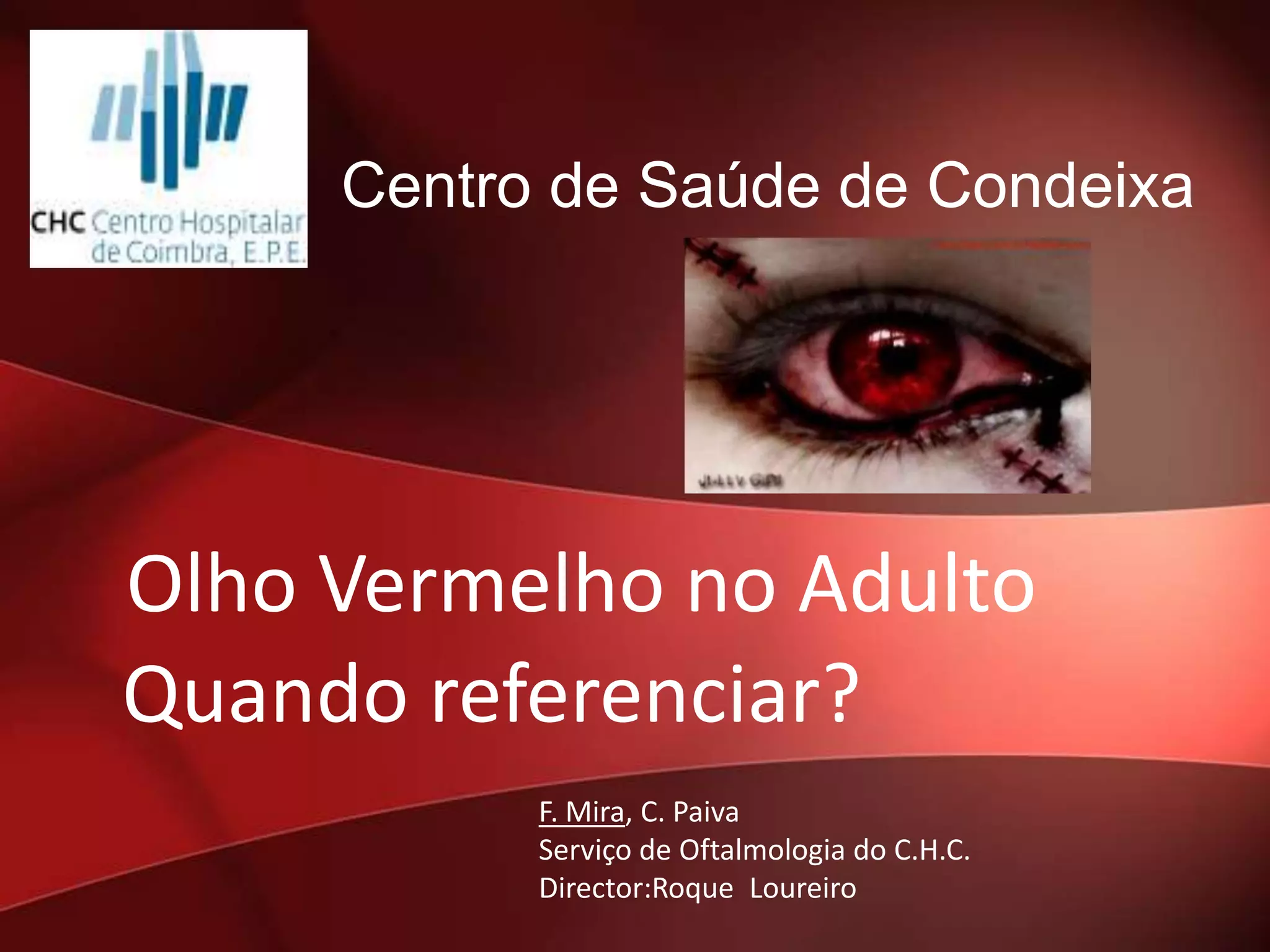 O documento fornece orientações sobre olho vermelho no adulto, descrevendo as principais causas, sinais e sintomas. Enfatiza a importância de uma história clínica detalhada e exame oftalmológico completo para identificar a etiologia. Recomenda referenciar casos com diminuição da acuidade visual, alterações recentes, situações traumáticas ou episódios frequentes de olho vermelho.