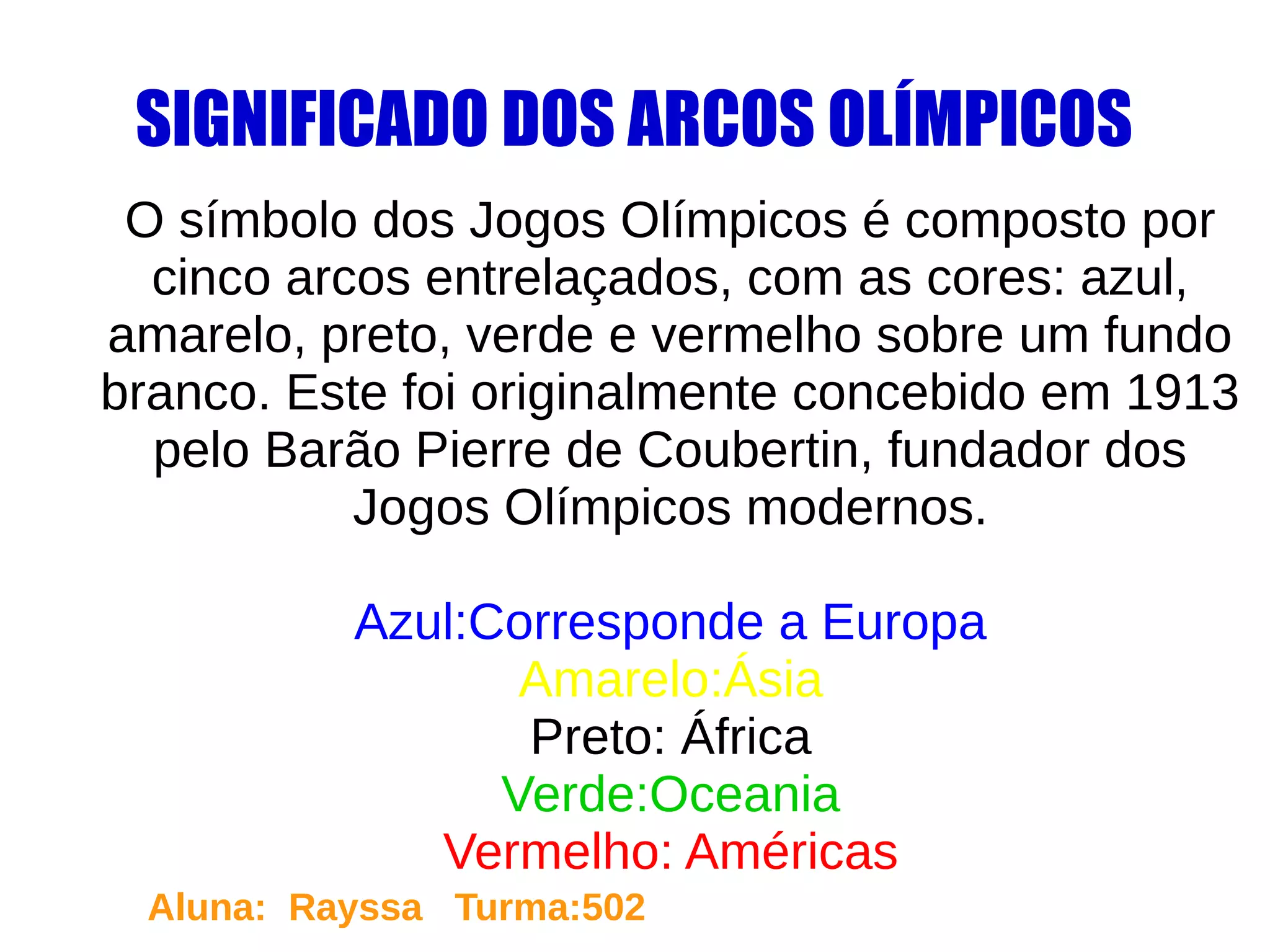 Os cinco arcos olímpicos representam as cinco partes do mundo e têm cores diferentes: azul, amarelo, preto, verde e vermelho sobre um fundo branco. Eles foram concebidos em 1913 por Pierre de Coubertin para simbolizar os Jogos Olímpicos modernos.