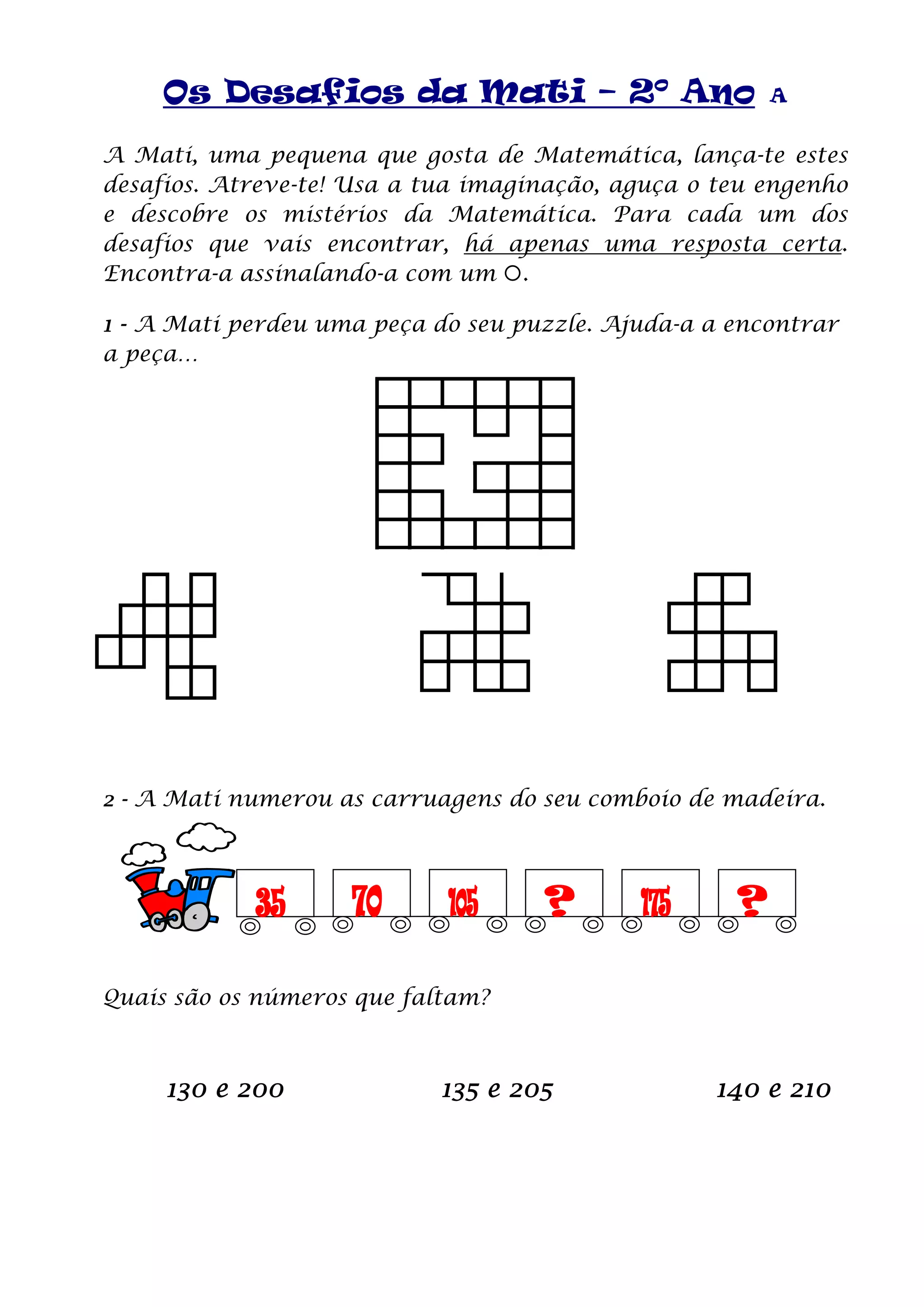 2) Os desafios incluem encontrar uma peça perdida de um puzzle, numerar as carruagens de um comboio de brinquedo, contar erros em um desenho, realizar uma jogada em um jogo e dividir bombons e maçãs em caixas e pratos.