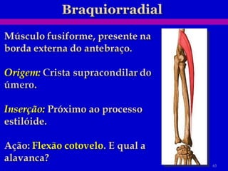 O documento descreve os principais músculos da região do punho e da mão, incluindo seus pontos de origem, inserção e ação. É dividido em seções sobre os músculos dos movimentos de flexão e extensão do punho, dos dedos e do polegar. Também inclui informações sobre articulações da mão e punho.