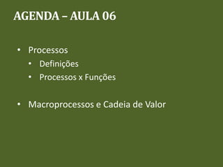 O documento aborda a definição e importância dos processos organizacionais, destacando a distinção entre processos e funções, além de apresentar o conceito de cadeia de valor. Enfatiza a necessidade de gerenciar processos de forma interfuncional para melhorar a eficiência e propõe um modelo de cadeia de valor com atividades primárias e de apoio. O conteúdo inclui exemplos práticos e sugere a utilização de ferramentas como fluxogramas e BPMN para mapeamento de processos.