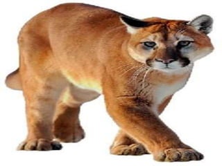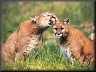 O documento descreve as características e comportamento da onça pintada e da onça parda. A onça pintada é o maior felino das Américas, podendo chegar a 135kg, e se alimenta de diversos mamíferos de porte médio e grande. Já a onça parda, também conhecida como suçuarana, é menor que a onça pintada e se alimenta de pequenos roedores e mamíferos de até 75kg. Ambas as espécies estão ameaçadas de extinção devido à perda de habitat e caça predat
