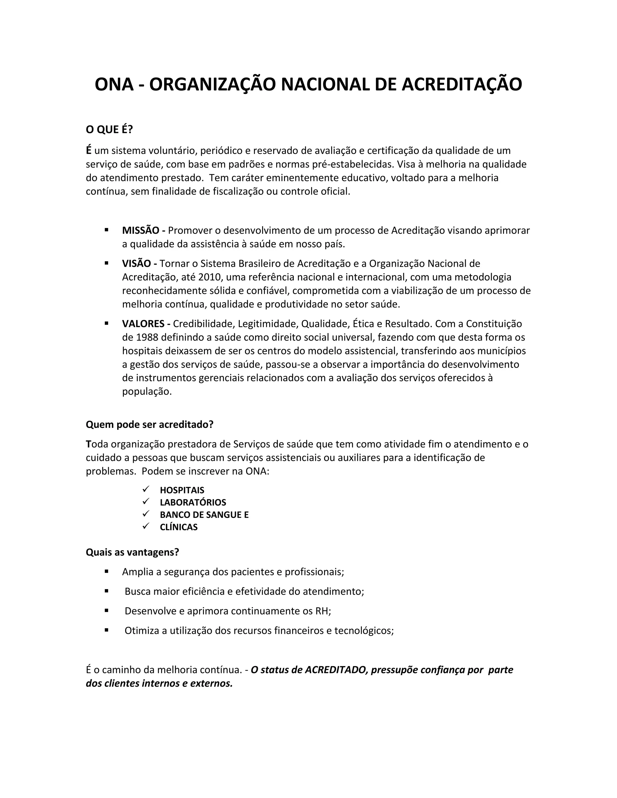 O documento descreve a Organização Nacional de Acreditação (ONA), um sistema voluntário de avaliação e certificação da qualidade em serviços de saúde no Brasil, com o objetivo de promover a melhoria contínua da assistência à saúde. Hospitais, laboratórios, bancos de sangue e clínicas podem aderir ao sistema de acreditação da ONA para obter certificação em três níveis de qualidade.