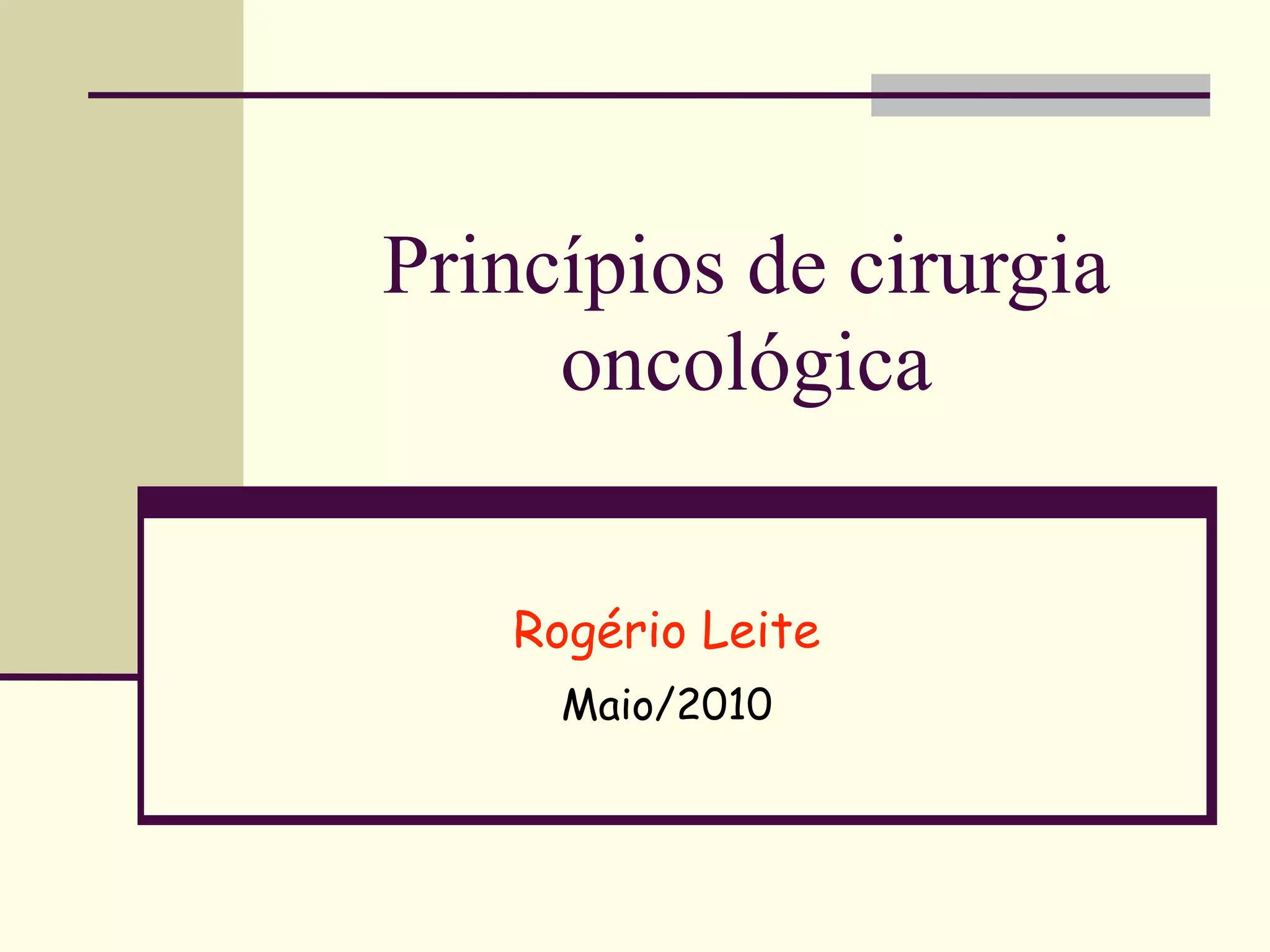 O documento discute os princípios da cirurgia oncológica, incluindo seu papel histórico como o primeiro tratamento eficaz contra o câncer e a abordagem multidisciplinar necessária. Também cobre tópicos como fatores de risco, tipos de cirurgia, planejamento cirúrgico, princípios gerais e aplicações atuais e futuras da cirurgia oncológica.