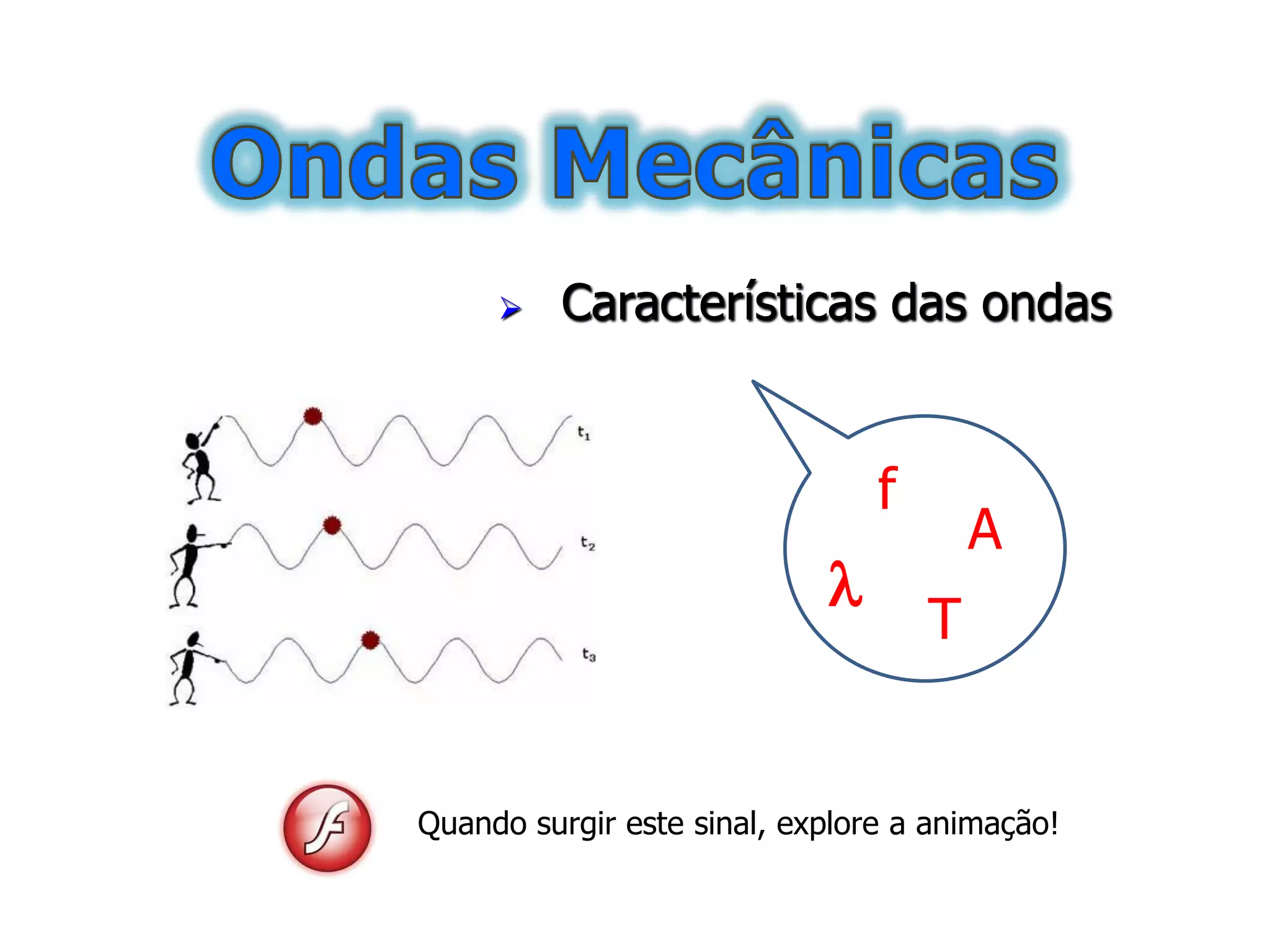 Este documento discute as características e propagação de ondas. Trata-se de ondas mecânicas e eletromagnéticas, incluindo suas diferenças. Explica conceitos como frequência, período, comprimento de onda e amplitude. Fornece também exemplos de cálculos envolvendo estas grandezas.