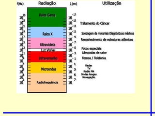 O documento descreve diferentes tipos de ondas, incluindo ondas mecânicas que transportam vibrações através da matéria e ondas eletromagnéticas que se propagam através do vácuo. Ele explica que as ondas podem ser transversais, com vibrações perpendiculares à direção de propagação, ou longitudinais, com vibrações paralelas. O documento também define termos-chave como comprimento de onda, frequência e velocidade de propagação de ondas.