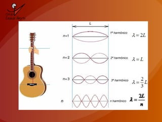O documento discute conceitos fundamentais da ondulatória, como a relação entre frequência e período, além de fenômenos ondulatórios como ressonância, difração e polarização. Também aborda qualidades do som, incluindo altura, intensidade e timbre, e descreve como instruments de cordas e sopro produzem som através de ondas sonoras. O efeito Doppler-Fizeau é mencionado, ressaltando a variação de frequência percebida devido ao movimento relativo entre fonte e observador.