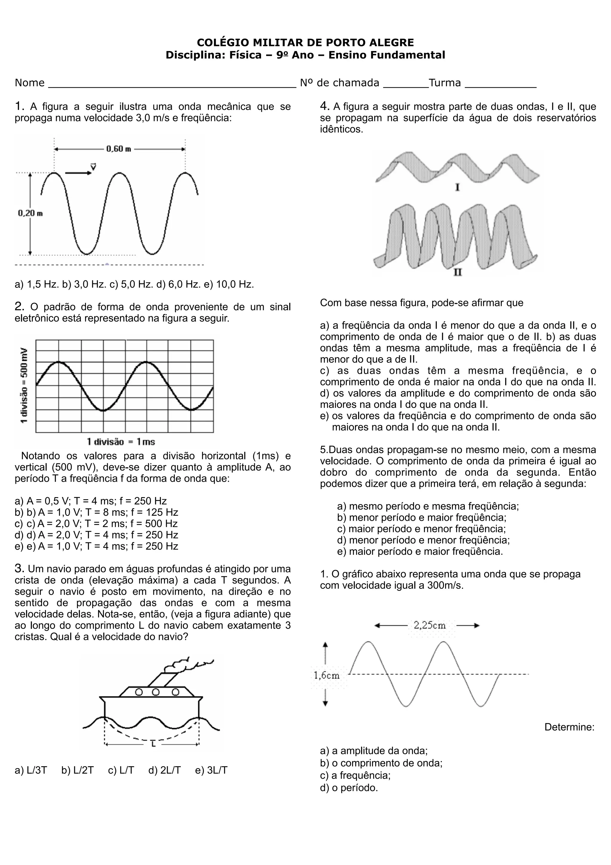 1) O documento contém um teste sobre conceitos de ondas com 5 questões e gráficos.