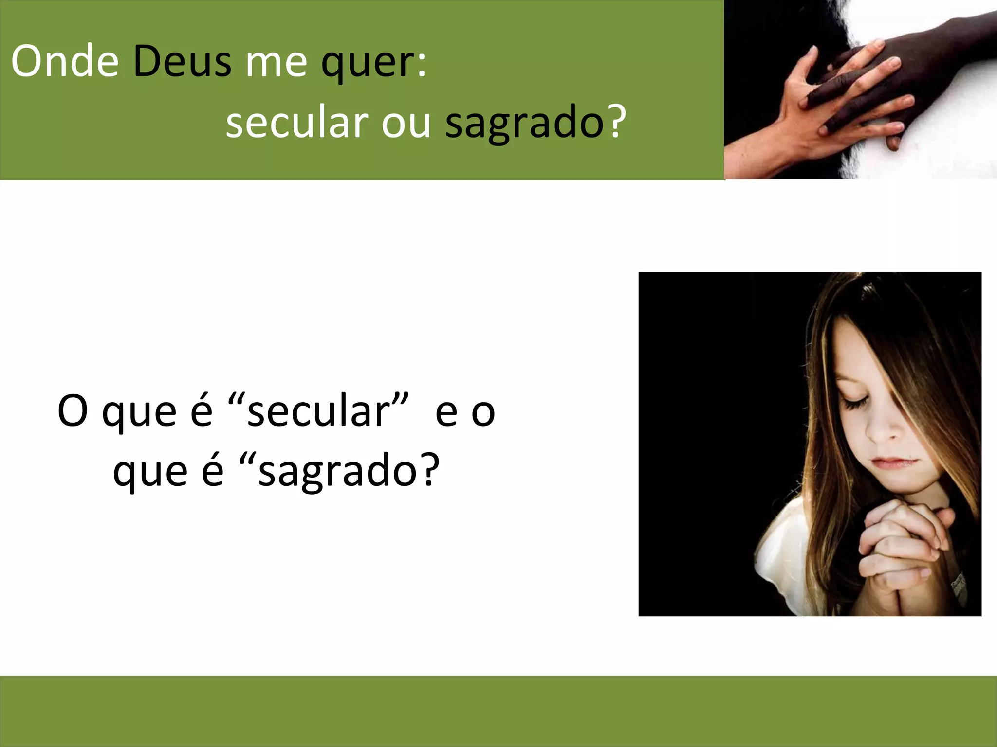 O documento discute onde Deus quer que estejamos, no secular ou no sagrado. A história de Ester é analisada, mostrando como ela teve que escolher entre revelar sua identidade judaica ao rei para salvar seu povo, arriscando sua própria vida, ou ficar calada e ver seu povo perecer. Mardoqueu aconselha Ester a agir, dizendo que ela chegou à posição de rainha para tal momento e que não é insubstituível. No final, Ester escolhe sacrificar-se para cumprir sua missão.