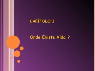 Este capítulo discute onde existe vida na Terra. A biosfera é definida como o conjunto de seres vivos e ambientes onde eles vivem. A biodiversidade é o conjunto de todos os seres vivos, cuja sobrevivência depende uns dos outros. Os seres vivos vivem nos meios terrestre, aquático e aéreo, com cada um tendo seu próprio habitat dentro desses ambientes.