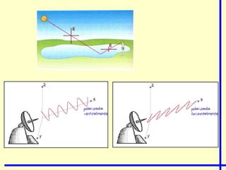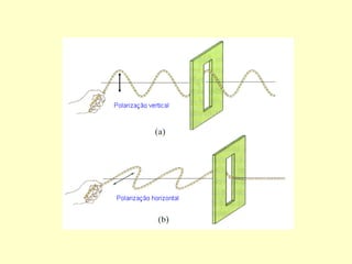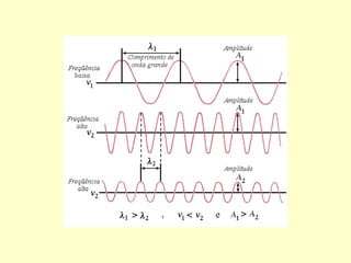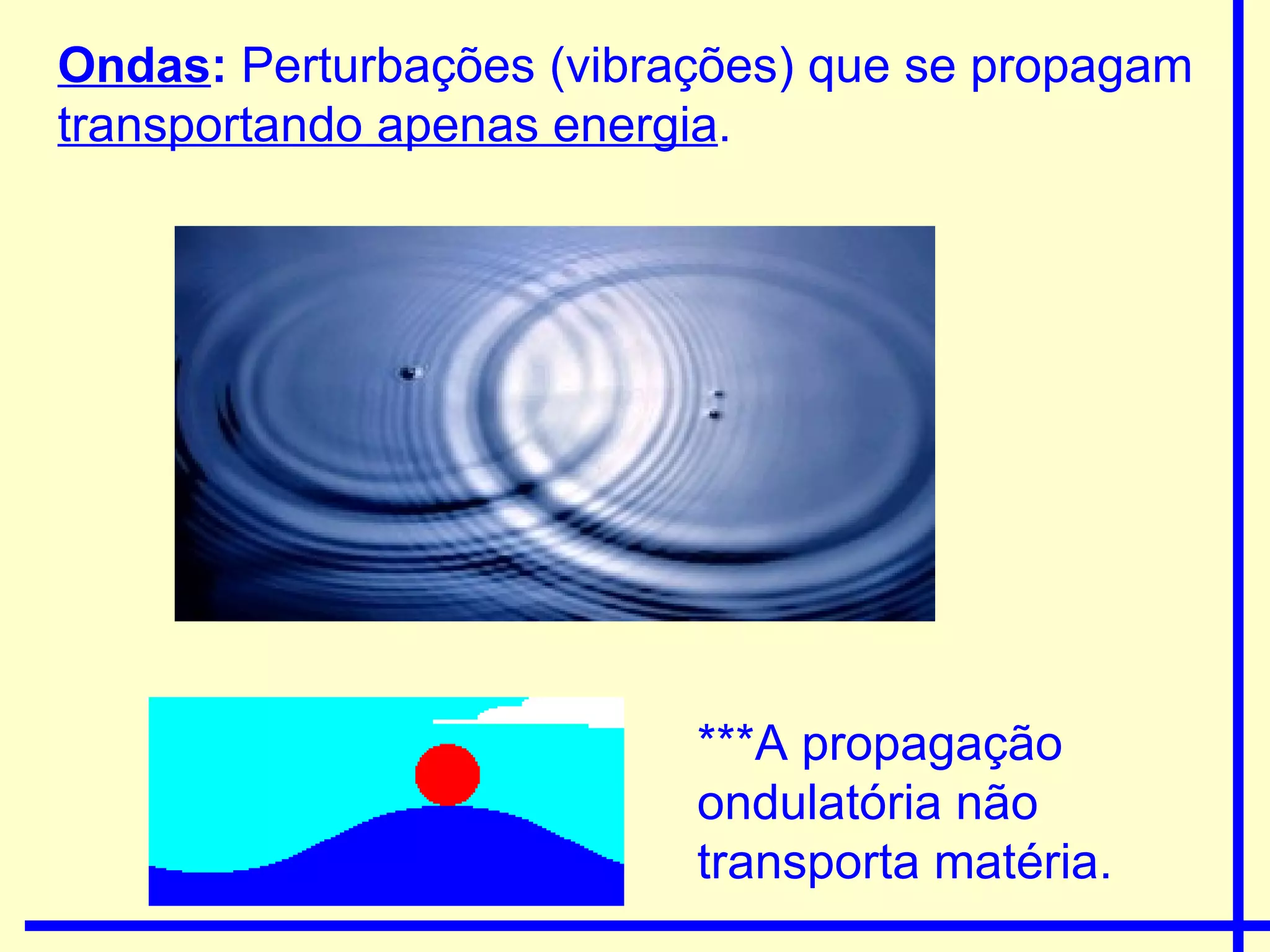 O documento discute as propriedades e classificação de ondas. Existem duas categorias principais de ondas: mecânicas, que requerem um meio material para se propagar, e eletromagnéticas, que podem se propagar no vácuo. Dentro dessas categorias, as ondas variam quanto à direção de propagação, vibração e outros fatores. Propriedades como comprimento de onda, frequência e velocidade determinam a natureza de diferentes tipos de ondas.