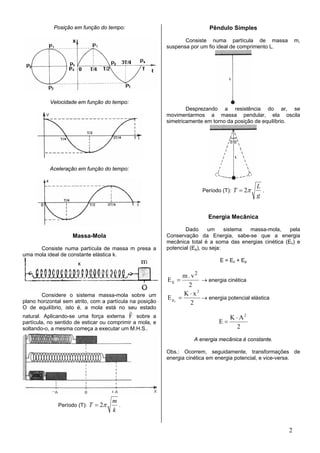 Este documento descreve os conceitos fundamentais do movimento harmônico simples e das ondas, incluindo suas definições, funções horárias, relações entre velocidade, aceleração e elongação, exemplos como o pêndulo e a massa-mola, além de fenômenos ondulatórios como reflexão, refração, interferência, difração e polarização.