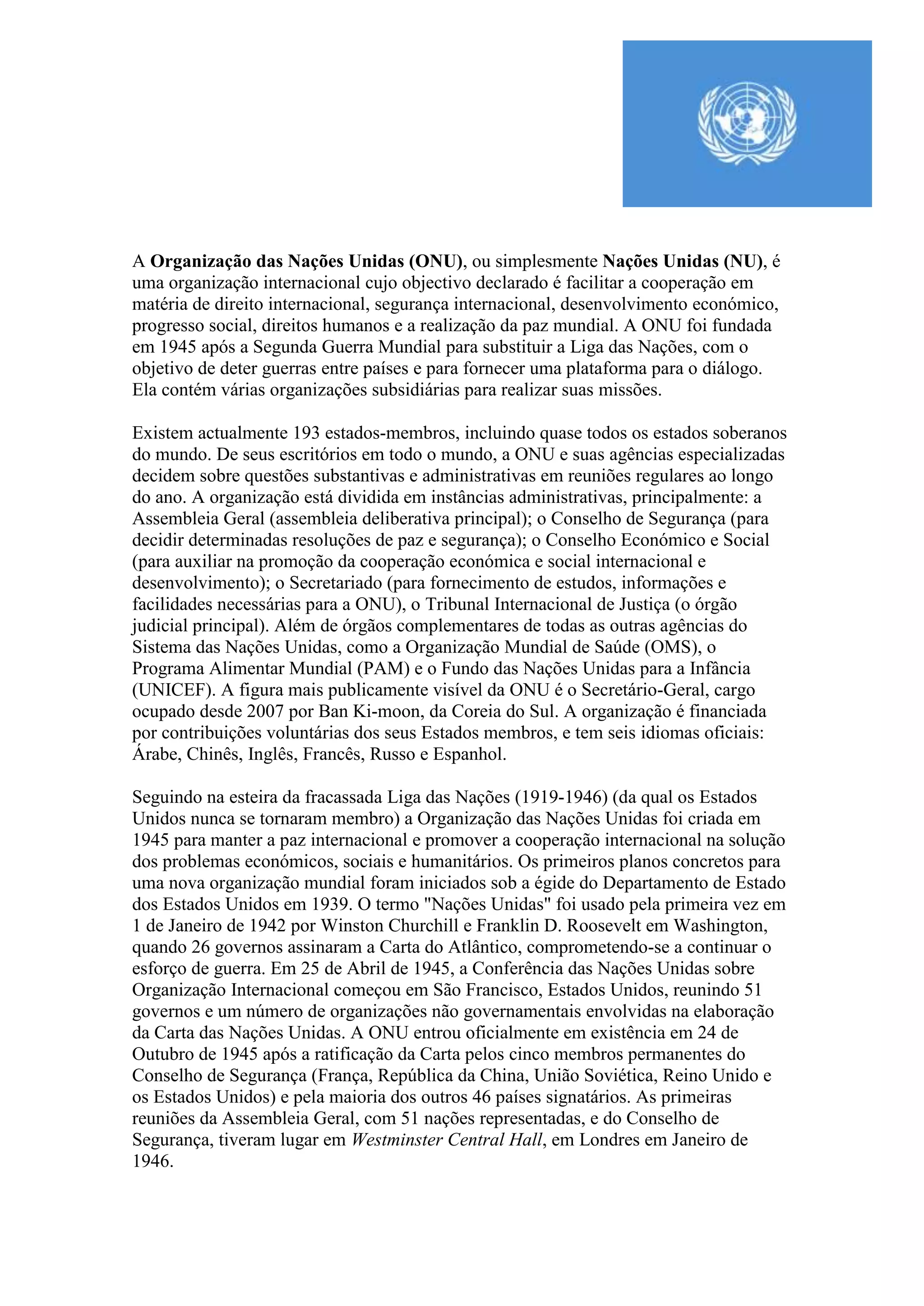 A ONU foi criada em 1945 para substituir a fracassada Liga das Nações e manter a paz internacional através da cooperação entre países. Tem 193 estados membros e trabalha em questões como direitos humanos, desenvolvimento e segurança através de agências como a OMS e o UNICEF. É financiada por contribuições voluntárias e tem seis idiomas oficiais.
