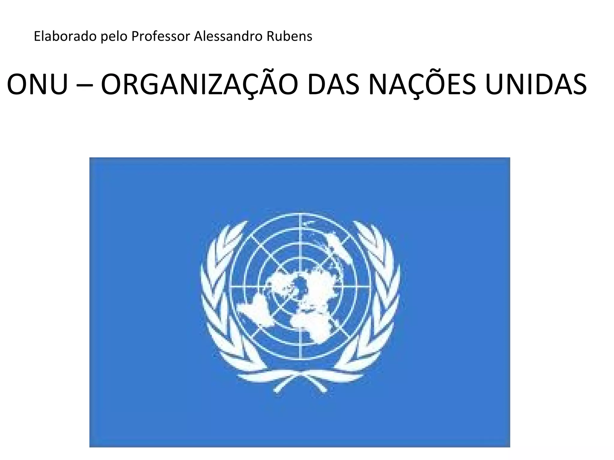 O documento fornece um resumo sobre a Organização das Nações Unidas (ONU). A ONU foi criada em 1945 para promover a paz, a segurança internacional e a cooperação entre os países. A assembléia geral e o conselho de segurança são as principais instâncias de deliberação, embora as resoluções do conselho de segurança sejam obrigatórias.