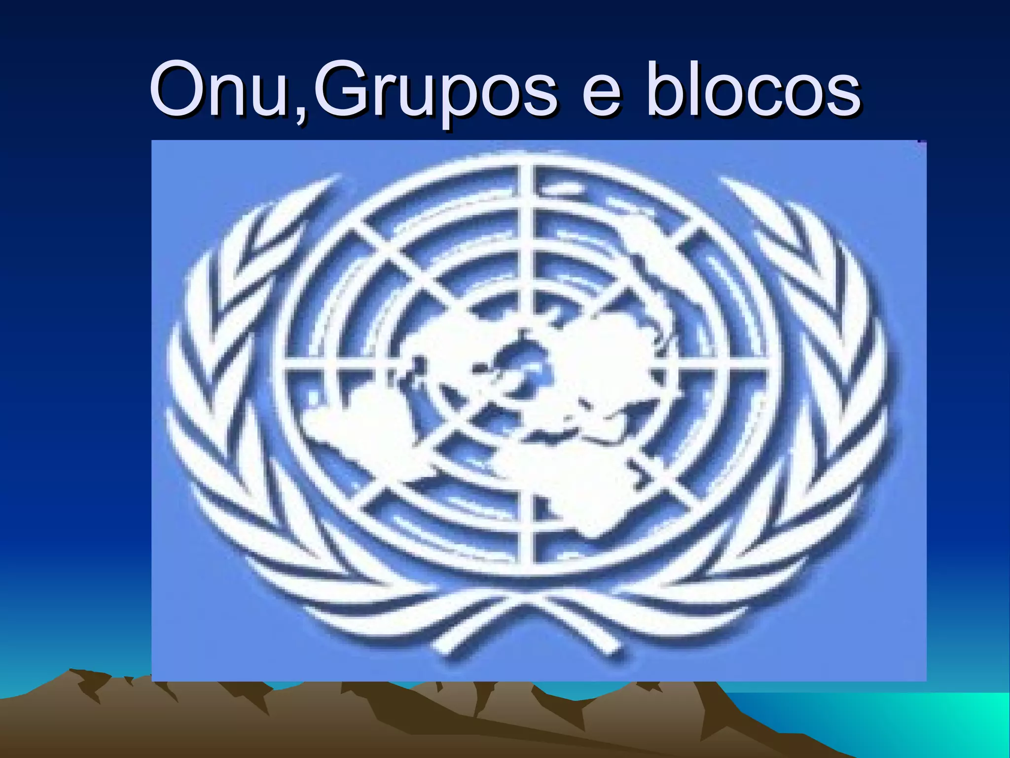 O documento descreve as principais organizações internacionais, como a ONU, seus objetivos de manter a paz, direitos humanos e desenvolvimento, e seus principais órgãos. Também apresenta blocos econômicos como o G20 e tipos de integração econômica entre países, como área de livre comércio, união aduaneira e mercado comum.