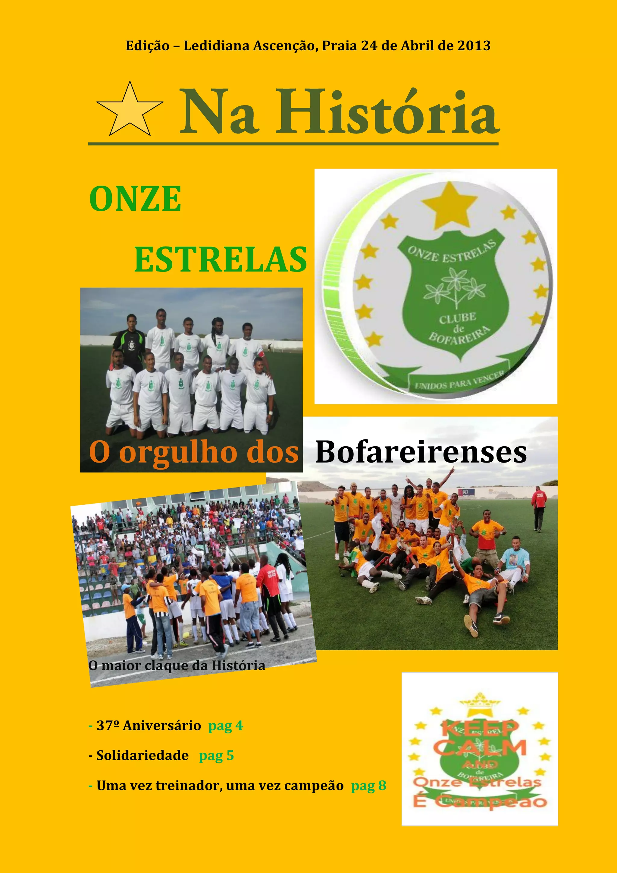 Este documento relata as atividades do clube de futebol Onze Estrelas da vila de Bofareira na ilha de Boavista em Cabo Verde. O documento celebra o 37o aniversário do clube, destaca suas ações de solidariedade na comunidade e a conquista do campeonato regional sob a liderança do novo treinador Vavá.