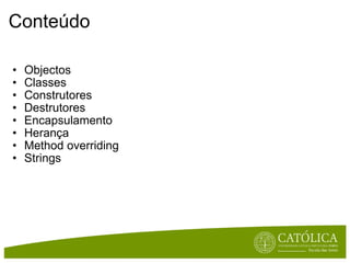 1) O documento apresenta os conceitos fundamentais da programação orientada a objetos (OOP), incluindo objetos, classes, construtores, encapsulamento, herança e overriding de métodos.