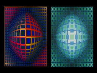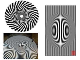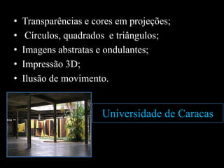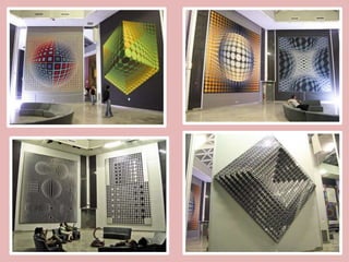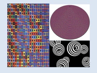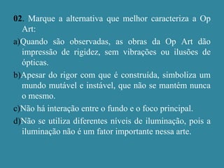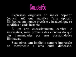 A Op Art surgiu na década de 1960 e explora ilusões ópticas através do uso de cores vibrantes, formas geométricas e contrastes. Victor Vasarely é considerado o pai da Op Art, criando obras que sugerem movimento através de círculos e quadrados sobrepostos. A arte buscava refletir a era tecnológica de forma cerebral e sistemática.