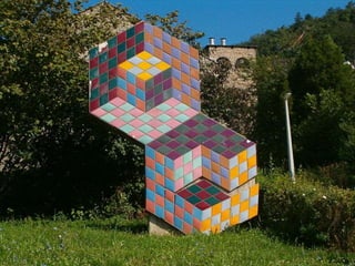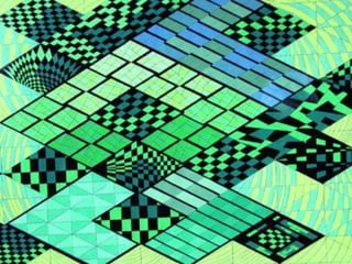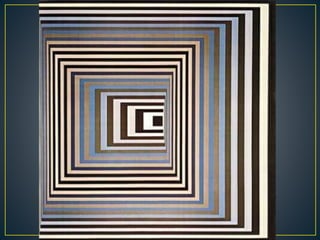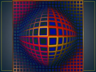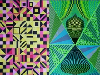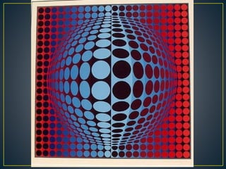 O documento descreve a Op Art, um estilo artístico que explora ilusões ópticas através do uso de cores e padrões que parecem se mover. A Op Art surgiu na década de 1950 e usa cores vibrantes, círculos e formas pulsantes para brincar com a percepção visual. Uma exposição chamada "Responsive Eye" ajudou a popularizar o estilo.