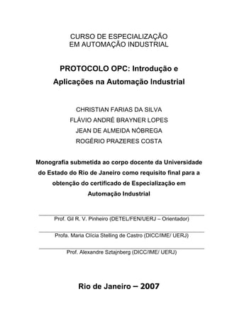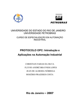 Este documento apresenta uma introdução ao protocolo OPC, descrevendo suas principais características e especificações. O OPC foi desenvolvido para promover a integração de sistemas industriais heterogêneos através de uma interface de comunicação padronizada. Inicialmente baseado na tecnologia DCOM da Microsoft, o OPC permite o acesso transparente a dados de processos independentemente de sua origem. Exemplos teóricos e reais demonstram aplicações do OPC em sistemas de controle, otimização e integração de re