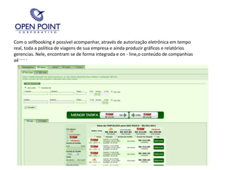 O documento descreve uma ferramenta inteligente para gerenciamento de políticas de viagens desenvolvida pela Lemontech que permite o acompanhamento e controle de viagens corporativas de forma econômica e em tempo real através dos módulos selfbooking e self-ticket. A ferramenta fornece relatórios gerenciais detalhados que fornecem informações para tomadas de decisões estratégicas.