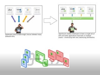 O OpenSocial é uma API que permite desenvolver aplicativos sociais compatíveis em diversas redes sociais, utilizando JavaScript, HTML e dados do Google. Foi lançado em 2007 e licenciado sob Creative Commons, possibilitando acesso a amigos, publicação de atualizações e armazenamento de dados.
