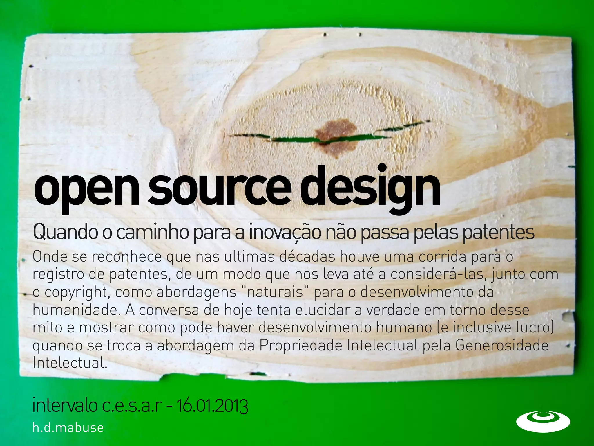 O documento discute como a abordagem da propriedade intelectual, como patentes e direitos autorais, não é necessariamente o único caminho para a inovação e desenvolvimento humano. A geração de conhecimento pode ocorrer por meio da generosidade intelectual em vez de focar exclusivamente na propriedade sobre as ideias.