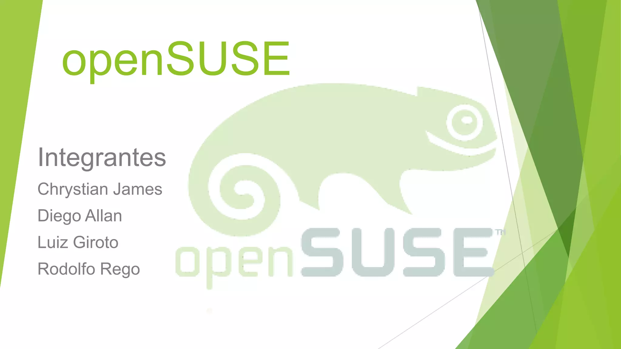 O documento descreve o openSUSE, incluindo sua história desde 1992, seu gerenciamento de pacotes do tipo rpm e a ferramenta YaST para configuração e instalação do sistema.