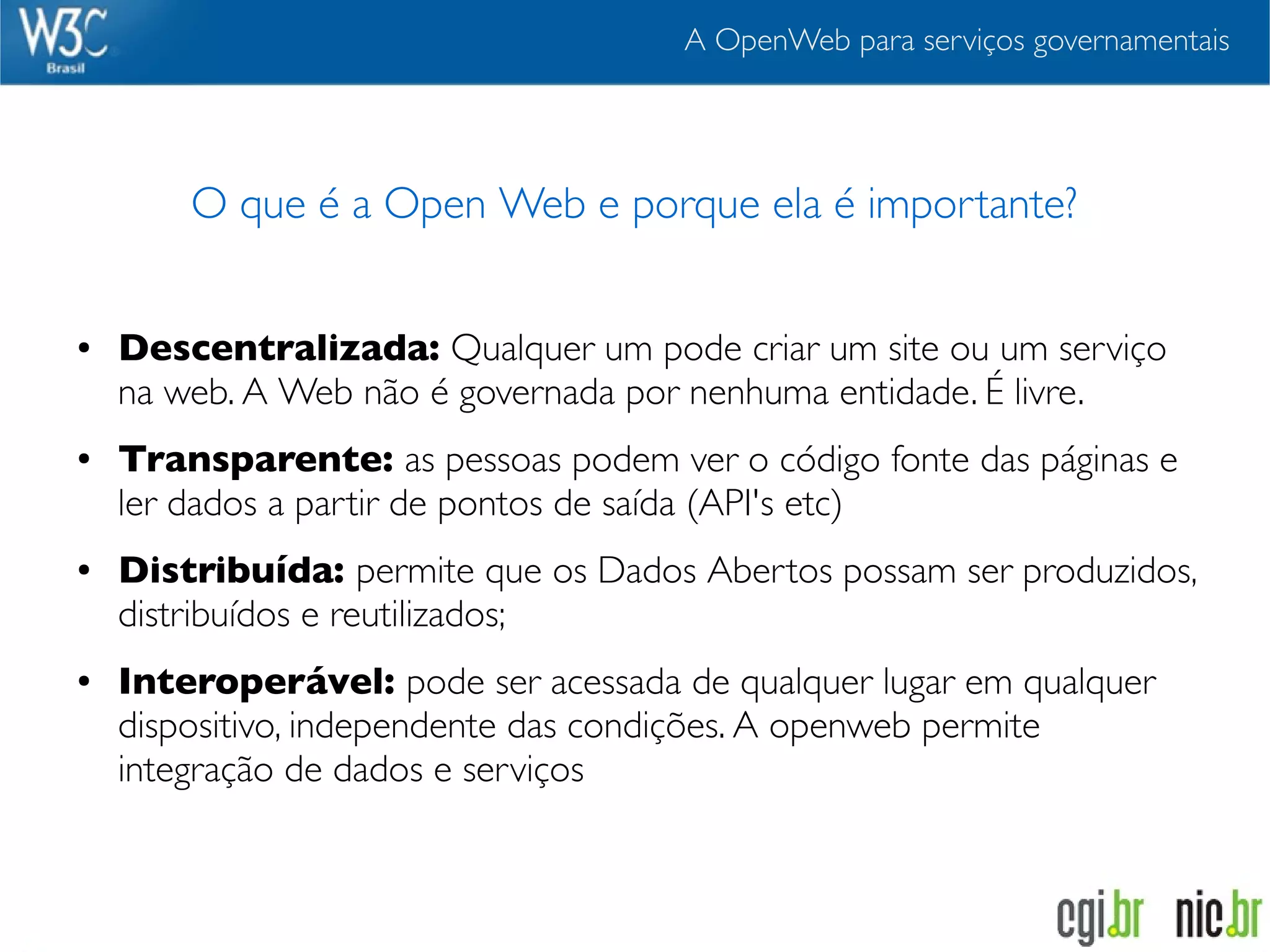 O documento discute os benefícios da OpenWeb para serviços governamentais, incluindo sua natureza descentralizada, transparente e interoperável. Ele também aborda como os dados abertos podem ser produzidos e reutilizados através da OpenWeb, e como isso pode melhorar o acesso dos cidadãos aos serviços governamentais.