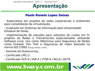 O documento discute porque utilizar o OpenLDAP, um software de código aberto que implementa um servidor LDAP. Ele fornece autenticação centralizada, segurança nas comunicações através de TLS/SSL e SASL, replicação de bases de dados LDAP, alta disponibilidade e integração com vários serviços. O OpenLDAP permite centralizar informações de usuários e senhas de forma segura e otimizada para consultas.