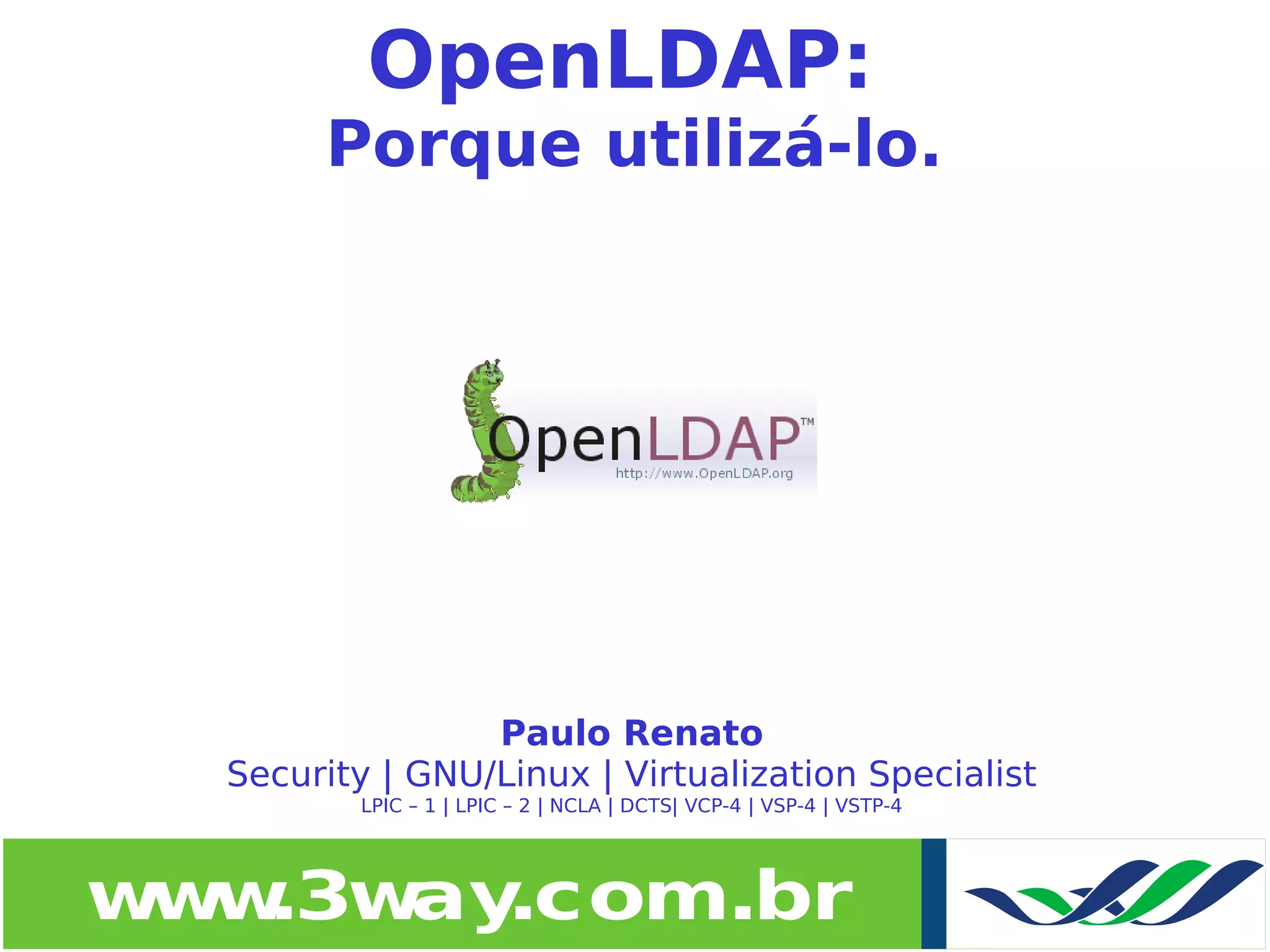 O documento discute porque utilizar o OpenLDAP, um software de código aberto que implementa um servidor LDAP. Ele fornece autenticação centralizada, segurança nas comunicações através de TLS/SSL e SASL, replicação de bases de dados LDAP, alta disponibilidade e integração com vários serviços. O OpenLDAP permite centralizar informações de usuários e senhas de forma segura e otimizada para consultas.