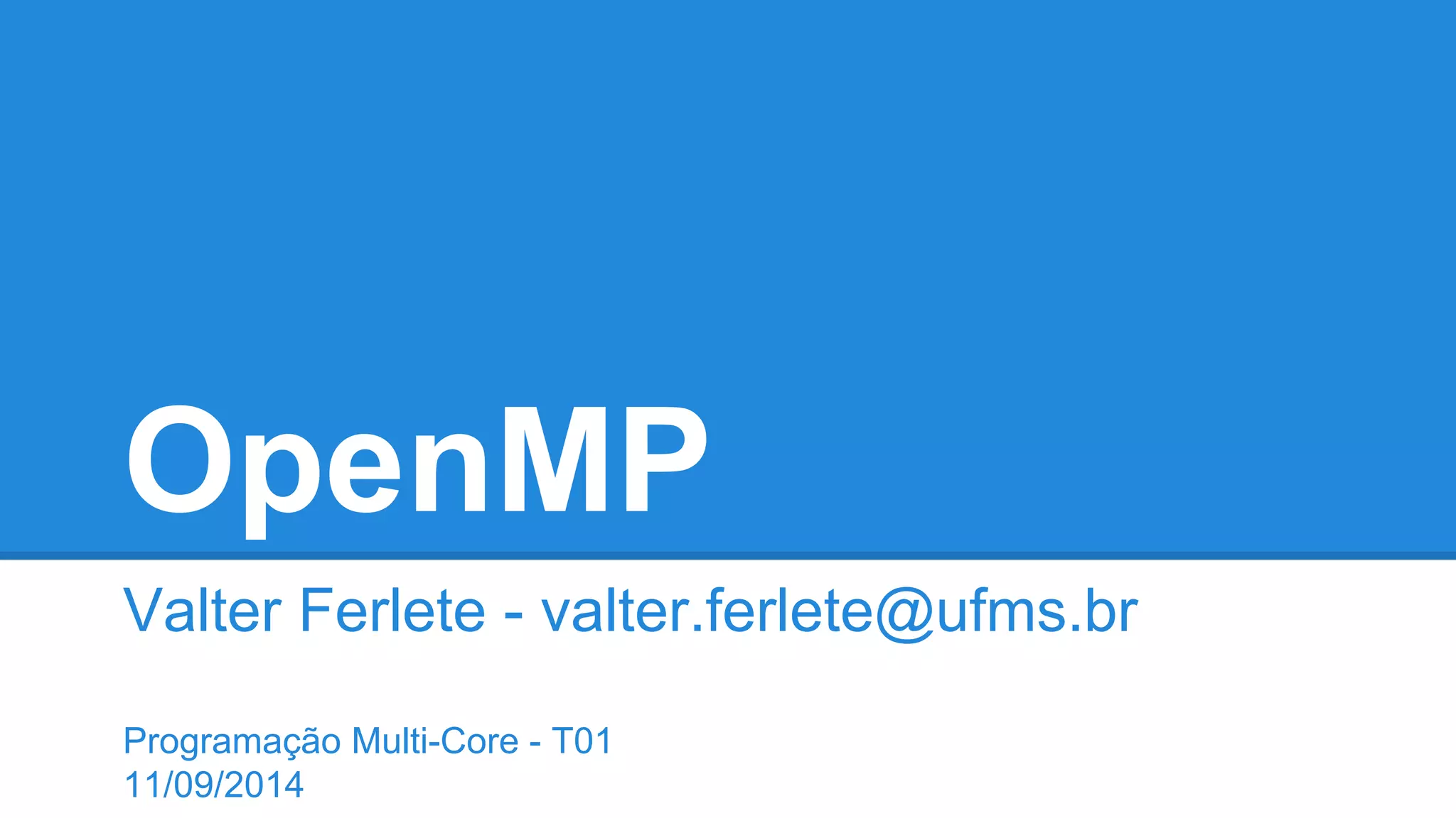 O documento apresenta uma introdução ao OpenMP, incluindo sua origem, objetivos, modelos de memória e execução, serviços, variáveis de ambiente e diretivas. É detalhada a sintaxe e uso de diretivas como parallel, for, sections e cláusulas como schedule e if.