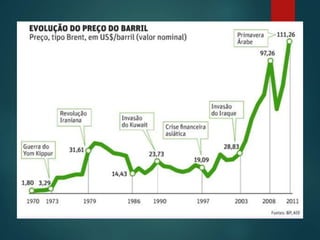 A OPEP é uma organização formada por países produtores de petróleo com o objetivo de estabelecer políticas comuns de produção e preços entre seus membros. O documento descreve a história da OPEP e das crises do petróleo, incluindo as razões por trás dos aumentos de preços, e lista os principais países produtores e reservas de petróleo.