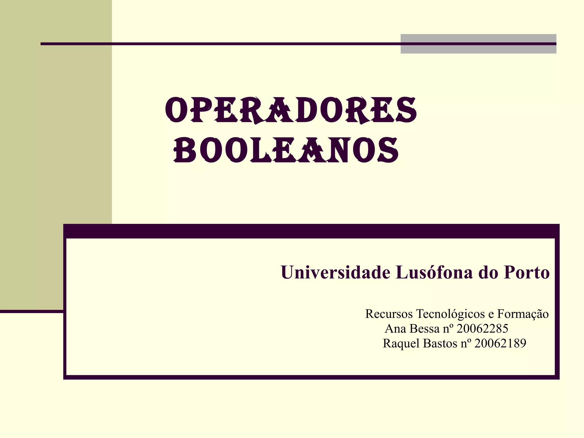 O documento descreve os conceitos fundamentais da álgebra Booleana, incluindo sua origem e aplicações. Detalha os operadores lógicos AND, OR e NOT e como eles são usados para refinar pesquisas em bases de dados. Explica também as partes internas e externas de um computador.