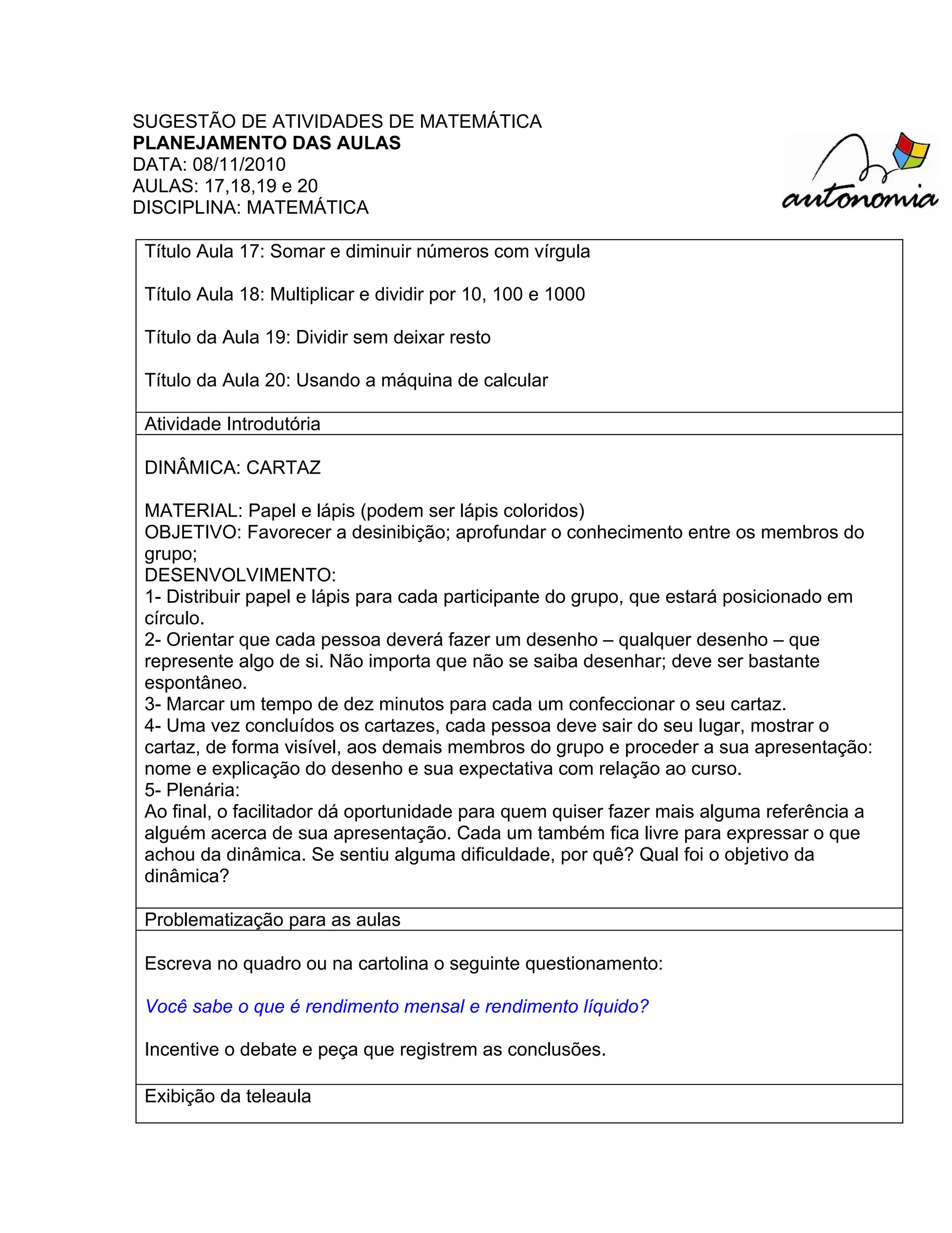 O documento apresenta sugestões de atividades de matemática para quatro aulas, incluindo somar e subtrair números decimais, multiplicar e dividir por potências de 10, dividir sem resto, e usar calculadora. Ele também fornece uma dinâmica introdutória, problemas para discussão, exercícios complementares e instruções para uma leitura guiada do livro didático.