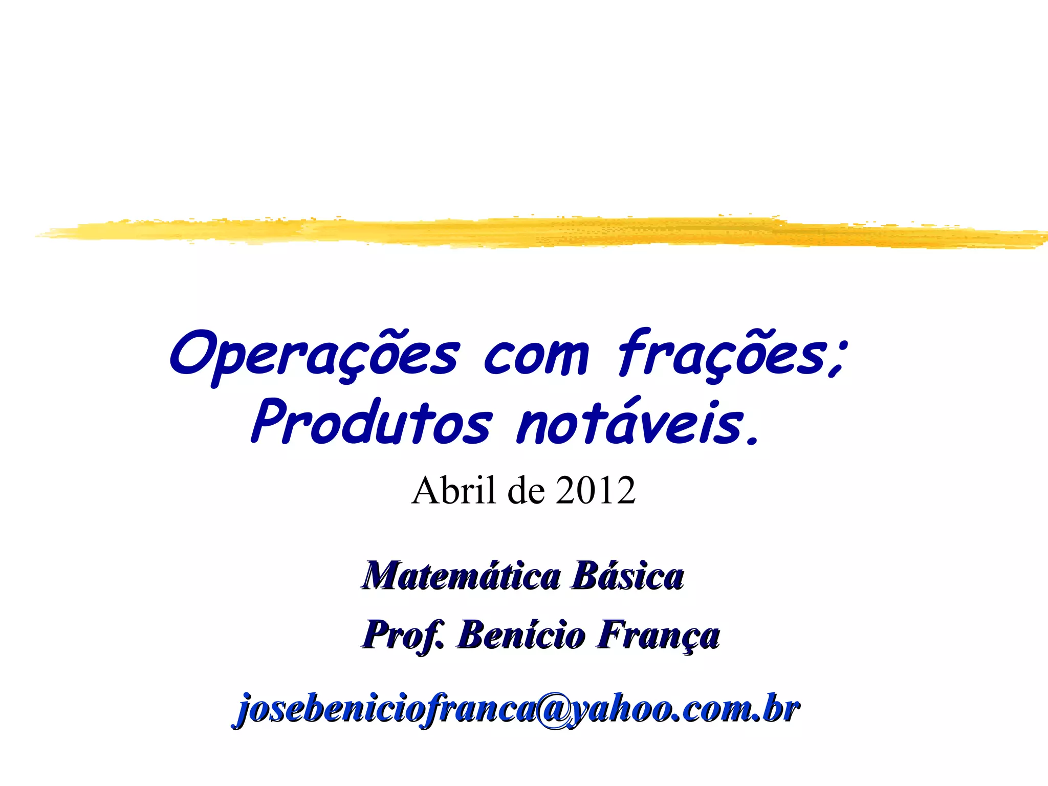 O documento apresenta os principais tópicos sobre operações com frações, incluindo frações equivalentes, adição, subtração, multiplicação e divisão de frações. Além disso, explica produtos notáveis como o quadrado da soma e da diferença de termos, cubo da soma e da diferença e a diferença e soma de cubos. A lista de exercícios contém questões sobre esses tópicos.
