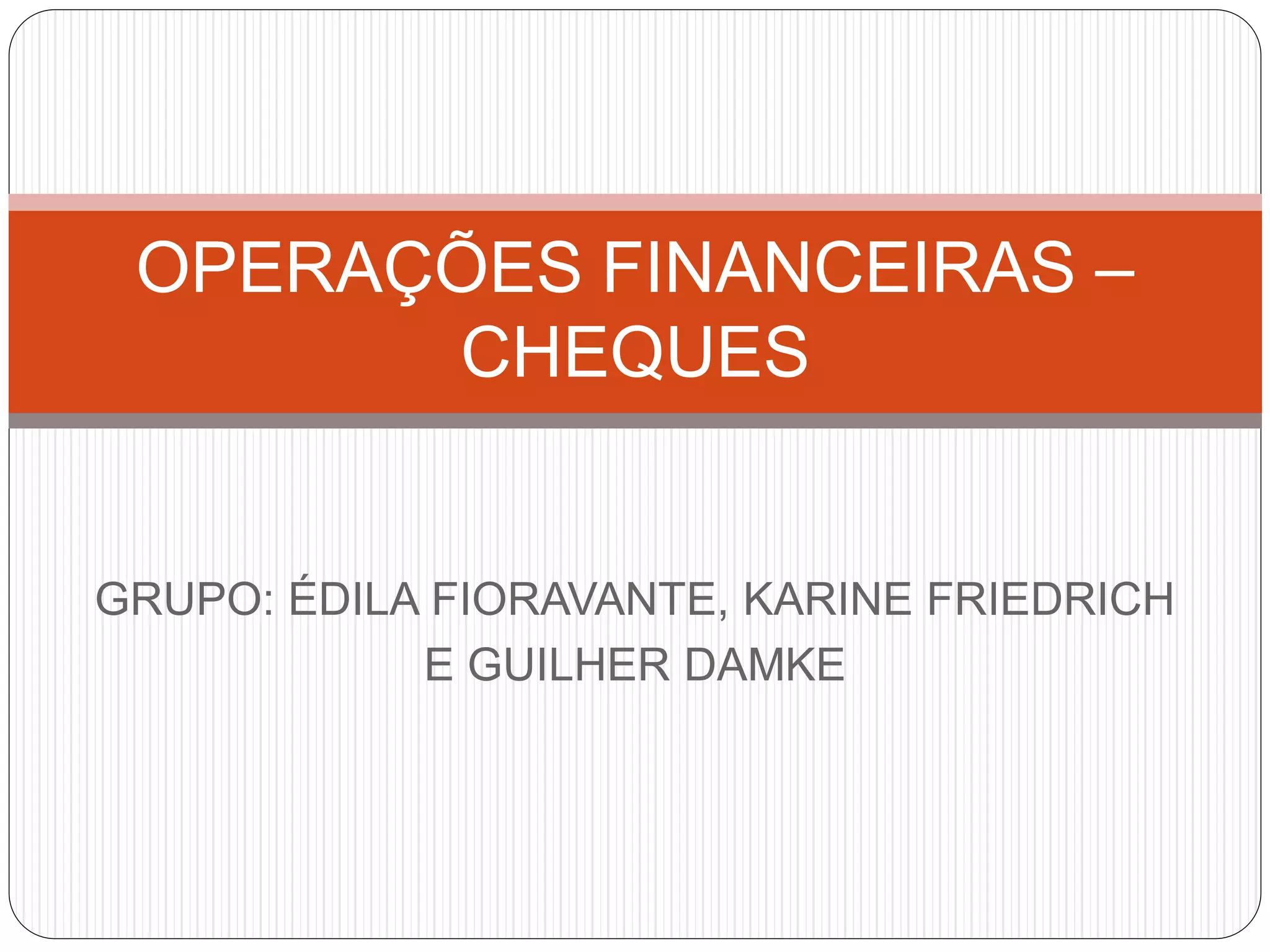 O documento discute a origem e regulamentação dos cheques no Brasil, apresentando seus principais tipos e formas de emissão. Explica que os cheques surgiram na Idade Média e são regulados pela Lei no 7.357/1985, descrevendo cheques ao portador, nominal, cruzado, administrativo, especial e pré-datado.